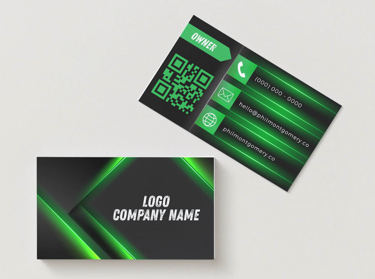 Get a sleek and professional look with this custom-designed black and green business card featuring neon-style accents. Perfect for business owners, entrepreneurs, and professionals who want to stand out.