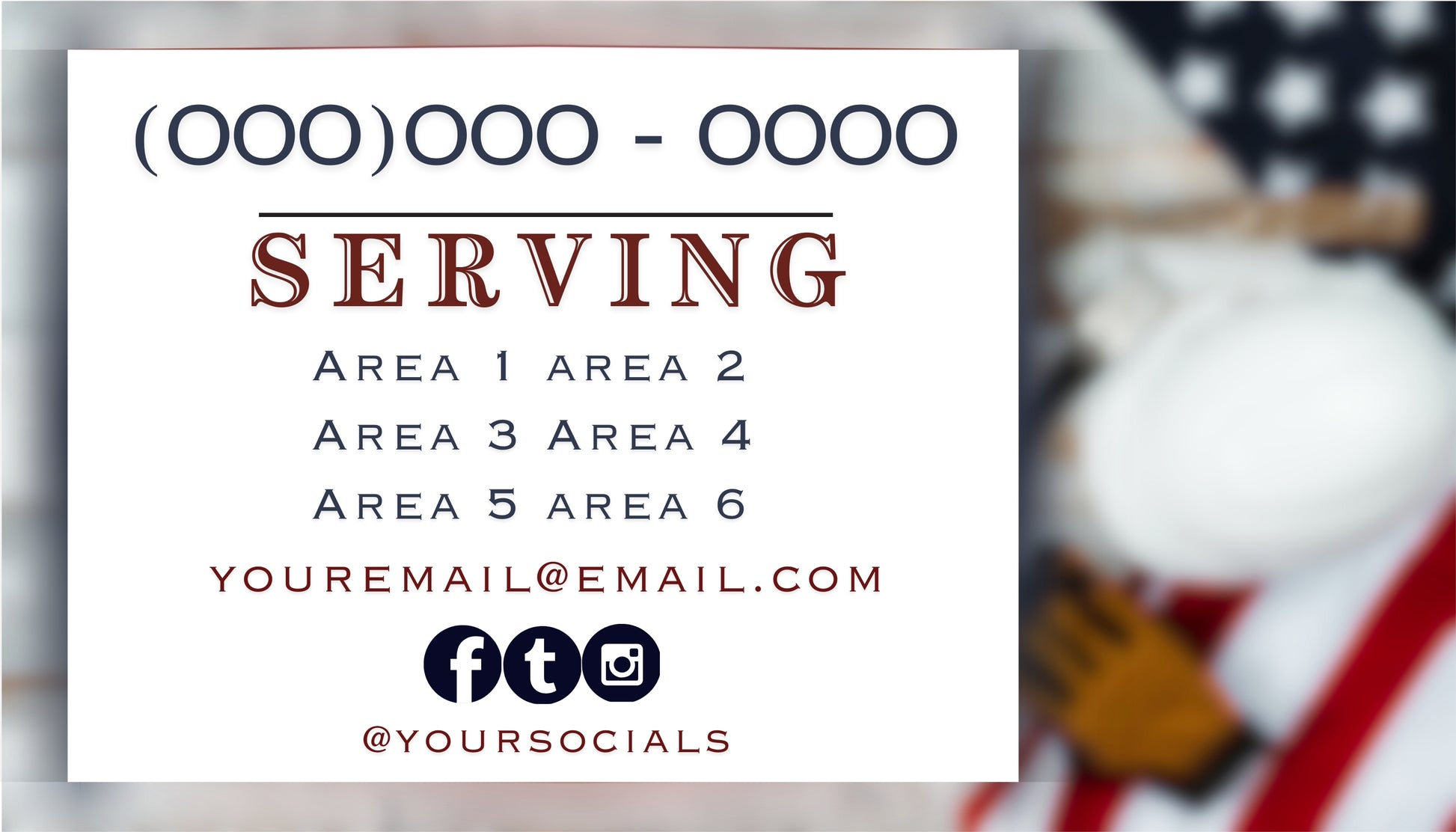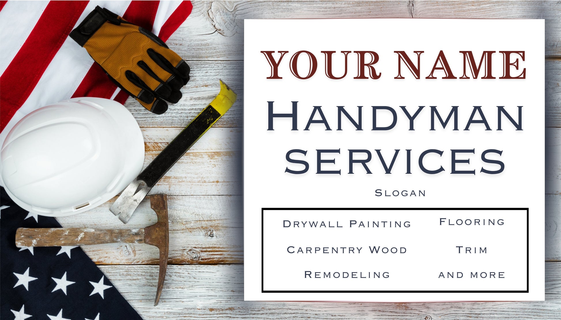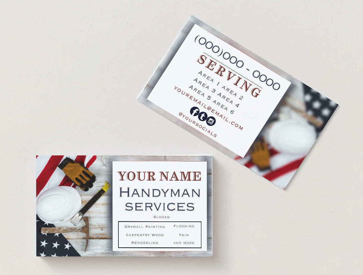 Promote your handyman or contracting business with this custom handyman services business card design. Featuring a clean layout with tools and the American flag background, this card is designed to give your business a professional and trustworthy look.